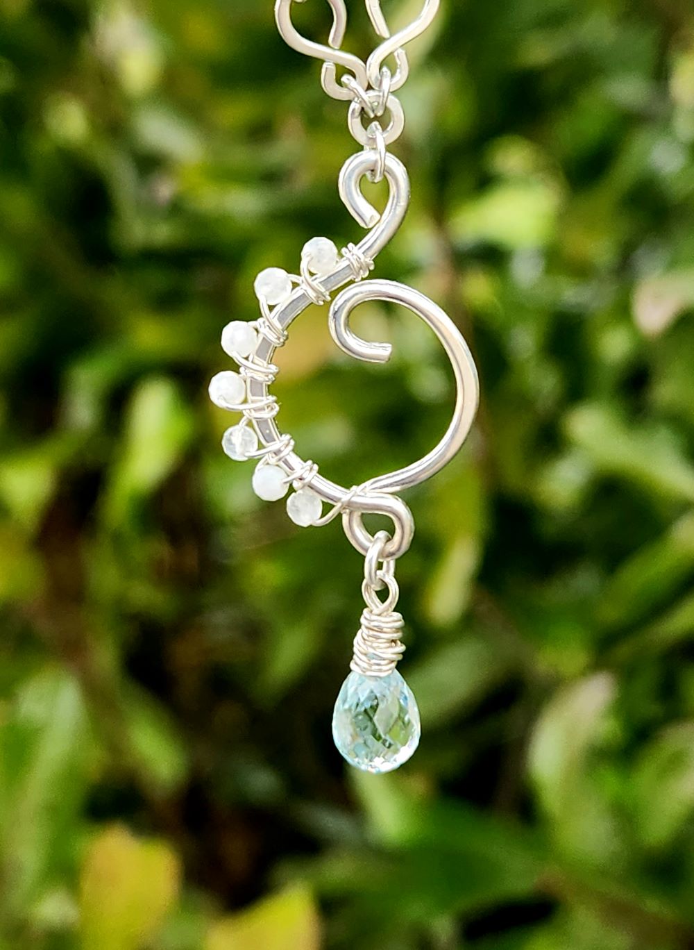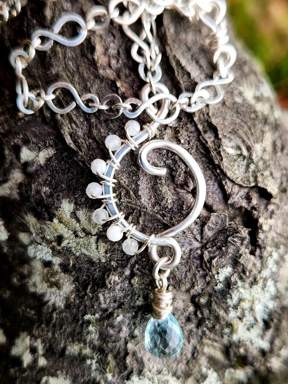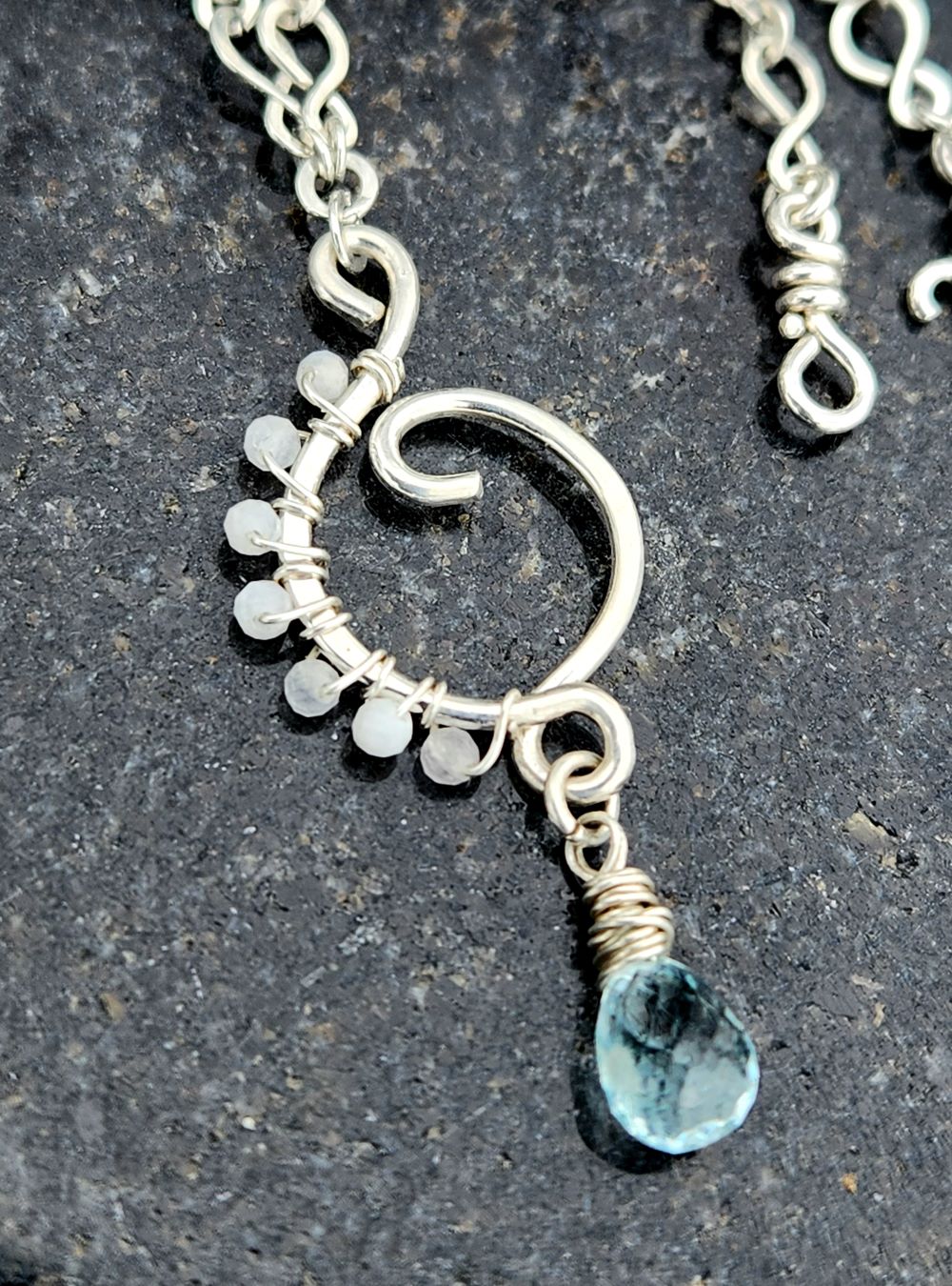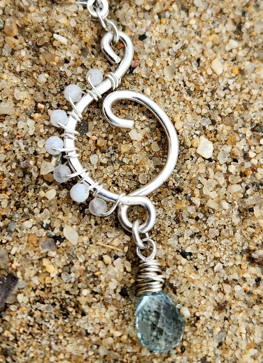 Sterling silver pendant with hand-wrapped rainbow moonstones and a clear aquamarine drop – lightweight, unique, and made to feel like the shoreline, wherever you are.